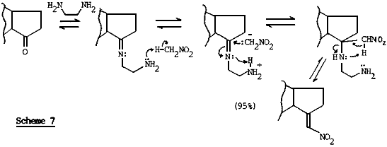 The general problems of low yields and complex mixtures in nitroalkene preparations via the condensation of nitromethane with aliphatic and alicyclic ketones24,29, was overcome by Barton and co-workers in an unprecedented reaction76,77. Bifunctional ethylenediamine was used in catalytic amounts, which probably helps to bring the reacting centers into close proximity then by overcoming steric barriers. The base also facilitates proton transfer as outlined in Scheme 7 thus assisting the addition of nitromethane anion and subsequently triggering the β-elimination of ethylenediamine. This explanation was supported by the absence of catalysis by simple primary amines.