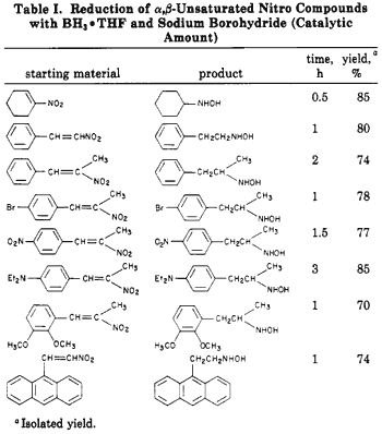 We have found that sodium borohydride catalyzes the reaction of borane complexes with a,ß-unsaturated nitro compounds, The reaction is straightforward. A catalytic amount of sodium borohydride is added to a normally unreactive mixture of the a,ß-unsaturated nitro compound and the borane complex at room temperature. The pure hydroxylamines are readily isolated in high yields (Eq 3). Our results are summarized in Table I.