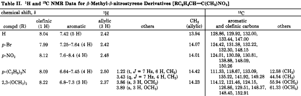 Commercially available samples (Aldrich) of 1-nitro-1-cyclohexene, ß-nitrostyrene, and 9-(ω-nitrovinyl)anthracene were used as received. Other nitro compounds were prepared via published procedures,9-11 and the spectral data are summarized in Table II.