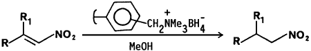 We wish to report that nitroalkenes are selectively reduced to nitroalkanes by borohydride supported on an ion exchange resin in methanol at room temperature. Borohydride bound resin was prepared by stirring a commercially available anion exchange resin, Amberlite IRA-400 (Cl- form) with aqueous sodium borohydride solution. The reaction procedure involves the addition of borohydride ion exchange resin to a methanolic solution of the nitroalkene. The reactions are complete within 60 min. and can be monitored by TLC (and in some cases by the disappearance of the yellow color of the nitroalkene). 11B-NMR spectroscopy of the methanolic reaction solution reveals no boron impurities. The product nitroalkanes are isolated by simple filtration and evaporation of the filtrate under reduced pressure. The resin may be reused by rinsing the spent material with dilute hydrochloric acid followed by regeneration with aqueous sodium borohydride solution.