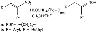 Dry ammonium formate (315 mg, 5.00 mmol) was added to a solution of nitroalkene (1.00 mmol) in a mixture of tetrahydrofuran and methanol (8 mL, 1:1, v/v). 5% Palladium-on-carbon (236 mg, 10 mol% Pd) was added to the solution, and the resulting mixture stirred at room temperature until all the starting material had been consumed (TLC). The catalyst was removed by filtration and washed with methylene chloride (10 mL) followed by absolute ethanol (10 mL). The solvent was removed under reduced pressure and the residue was washed with water (10 mL) and the product was extracted into methylene chloride (2x20 mL). The crude product was purified by chromatography on a silica gel column using methylene chloride to elute the ketone and absolute ethanol to elute the oxime.