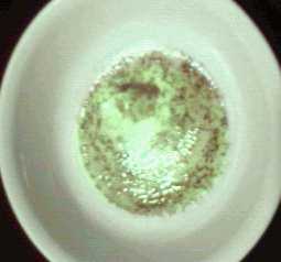 The remaining liquid was again concentrated on a hot water bath. When the last of the Acetone and water evaporated, the hot water bath became a boiling water bath. I was playing a computer game and did not notice until I began to cough unexplainably. Apparently the Oxalic Acid had begun to decompose into Carbon Dioxide and Carbon Monoxide (!). The dish was promptly removed from the heat and some cursing was in order... The residue seemed to solidify as it cooled and dried. It was quite brown. Strange because the starting material was very white. Suspect decomposition. The residue was pulverized, dissolved in acetone, and allowed to settle for 15 minutes. A small amount of un-dissolved solids were removed and dissolved in water. The water was evaporated yielding the sticky green semi-solid seen at left. The original picture was more brown than it should have been so the green was enhanced to approximate the actual color. This substance was somewhat foamy when washed down the drain.