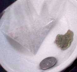 A small bit of the powder was put on this spoon. The spoon was put directly onto a hot stove where it quickly lost most of its volume as a gas that tickled the back of the throat triggering a cough reflex. A small amount of carbonized crap remained.