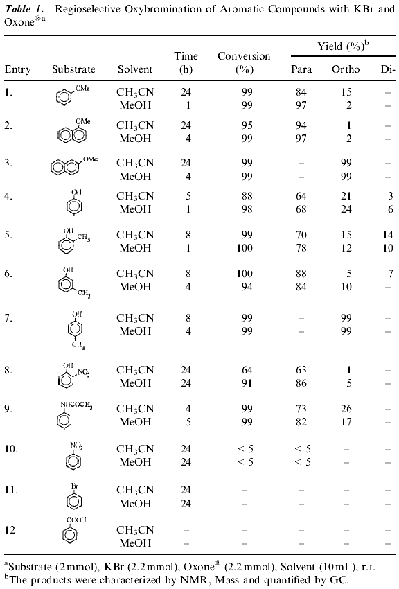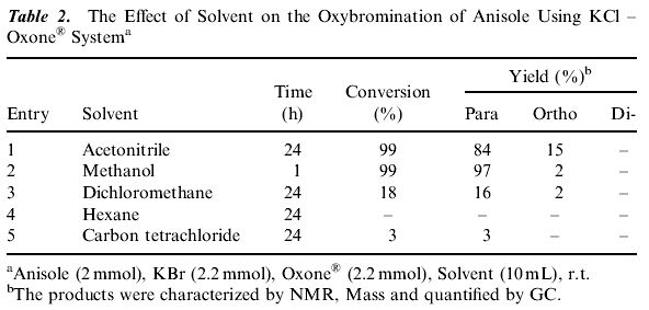 Potassium peroxymonosulfate is an inexpensive and readily accessible oxidizing agent. It is commonly used as Oxone® (2 KHSO5·KHSO4·K2SO4) and is a versatile oxidant for the transformation of a wide range of functional groups. (16) A number of different aromatic substrates were subjected to the bromination reaction to test the generality of this method and the results are summarized in Table 1 . Efficient bromination of aromatic substrates with good yields and regioselectivity observed with acetonitrile, methanol as solvents (Table 1). As Table 1 shows that the reaction gives high yields and para-selectivity for a range of substituted benzenes of high activity. The results in Table 1 indicate that activated aromatic compounds are more selective for nuclear bromination. Introduction of an electron- withdrawing group on the aromatic ring substantially decreases the rate of ring bromination (Table 1 , Entry 8) while on electron donating group increases it. These system yield selectively para brominated aromatics unless the para-position (Table 1 , Entry 7) is substituted. The para substituted aromatics were brominated in the ortho-position. 2-Methoxy-naphthalene gives 1-bromo-2-methoxy naphthalene. When the less reactive aromatics such as bromobenzene, nitrobenzene, benzoic acid failed to undergo bromination under the same reaction conditions. A wide range of solvents have been employed in these reactions including, carbon tetrachloride, hexane, dichloromethane, methanol and acetonitrile. The best results were obtained when acetonitrile, methanol were used as solvents compared to others (Table 2). The reaction is very fast in methanol compared to acetonitrile.