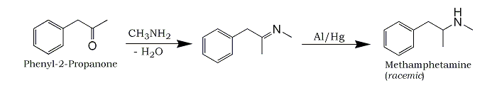 To the aluminum amalgam there was added 29.5g methylamine hydrochloride (0.44 mol, 3 eqv) dissolved in 30ml hot water, 75 ml isopropanol, 70ml 25% aqueous NaOH (0.44 mol), 19.75g (0.147 mol) phenyl-2-propanone (P2P) and finally 175ml isopropanol. Hydrogen was vigorously evolved from the aluminum amalgam, and the temperature of the solution rose quickly. The reaction rate was controlled by immersing the reaction flask in cold water during 2h, whereafter it was allowed to stand at room temperature with magnetic stirring overnight, with attention being given to the reaction mixture during the first hour so that the temperature did not rise over 50°C.