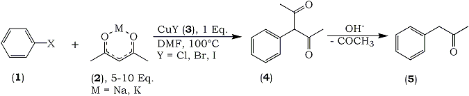 We investigated the direct arylation of acetylacetone with aryl halides without the aid of such a carboxyl group. Consequently, we could obtain 3-arylaetones from the reaction in the presence of Cu(I) halide. Since these 3-arylacetylacetones trend to deacetylate under alkaline condition, subsequent deacetylation in diluted alkaline solution in the same pot afforded the corresponding arylacetones in good yields. This procedure must be simple because two steps reaction can be performed in a one-pot.