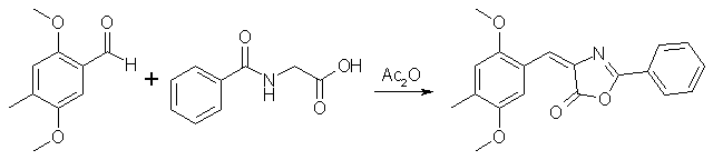 A mixture of 2,5-Dimethoxy-4-methylbenzaldehyde (15.0g), hippuric acid (15.0g), acetic anhydride (26.0g) and anhydrous sodium acetate (7.0g) was heated with stirring at 100°C for 2 hours, cooled and diluted with 100ml ethanol. An orange-red precipitate of the title compound precipitated, yield 23.6g, mp 208-210°C. Methyl 2,5-Dimethoxy-4-methyl-phenylacetate [1]