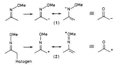 Oxime ethers can be efficiently metallated at the alpha-carbon atoms and the derived enolate equivalents (1) can then participate in a variety of useful C-C bond forming reactions. 1 The alpha-carbon might also support a positive charge [i.e. (2)] stabilized by n-type electron delocalization from the oxime group, and this cation could act as a synthetic equivalent of an 1-acylcarbonium ion 2. In this communication we describe a method for the conversion of oxime ethers into functionalized ketones using reactive intermediates of type (1) or (2), employing acetone O-methyloxime as a model compound.