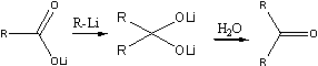 On the addition of methyllithium to the lithium salt of a carboxylic acid, the carbanion with its unshared electron pair adds to the sextet of the carboxylic acid anion, with the formation of a new carbon-carbon bond, and the oxygen with one of its unshared electron pairs forms a bond with the lithium atom The dilithium salt of the dihydroxymethane thus obtained is hydrolysed by water to give the methyl ketone.