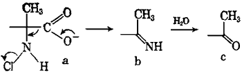 The oxidative degradation IV → V would appear clearly to be initiated by N-chlorination (compare a ⇒ b ⇒ c) inasmuch as the N-acetate derivative III is unchanged under the conditions of hypochlorite oxidation, whereas the latter (III) is oxidized smoothly by lead tetraacetate, a reagent known to attack carboxyl functions.