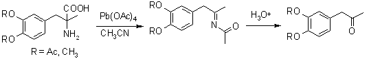 The diacetoxy ketone was converted in good yield by the appropriate processes to the corresponding dimethoxyketone V and to the dihydroxy hydantoin and alpha-methyl-DOPA. Similar lead tetraacetate treatment of the N-acetyldimethoxyamino acid IIIc in CH3CN-pyridine led to the dimethoxy ketone V.