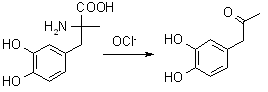 The direct hypochlorite oxidation of alpha-methyl-DOPA itself proceeds in the desired manner to give 3,4-dihydroxyphenylacetone in ca. 50% yield. The latter substance is highly water soluble and sensitive as well to manipulation, although it can be methylated to V in reasonable yield. To a large and competitive extent, however, the direct hypochlorite oxidation of alpha-methyl-DOPA involves nuclear attack as evidenced by accompanying resinification. The use of t-butyl hypochlorite was found to be superior to sodium hypochlorite in this instance and suggests, thereby, that the breakdown reaction to ketone is faster than nuclear involvement. The hypochlorite degradation of the 3-monomethyl ether of alpha-methyl-DOPA to 3-methoxy-4-hydroxyphenylacetone also can be accomplished in at least 60-70% yield.