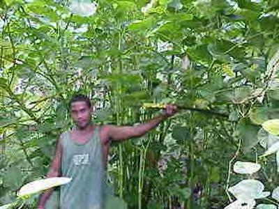 Piper aduncum. That's from aduncus: bent, crooked, curved, hooked. Not because it's a shady character, but because its leaves flop down. It may as well be a shady character, considering all its aliases. It has no fewer than 27(!) synonyms in the published literature, that's binomial Latin nomenclature. The main one is P. angustifolium, these are the same plant. What you asked, its English common name, is Matico pepper (as P. angustifolium), or Spiked pepper (as P. aduncum). In Spanish it's Cordoncillo or Higuillo de Hoja Menuda; Portugese, Aperta-ruao. The Chinese have a name for it, Xia ye hu jiao. Piper auritum