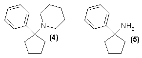 The intermediate cyclohexanecarbonitrile can be prepared from the bisulfite addition product of cyclohexanone by treatment with KCN and piperidine6, or by the addition of cyclohexanone and KCN to an aqueous solution of piperidine hydrochloride7. Both procedures give excellent yields. The Grignard reaction is conventional, being worked up either with HBr or NH4Cl. The use of phenyl lithium in place of phenyl magnesium bromide results in addition to the nitrile rather than in its displacement. Efforts to prepare the cyclopentyl homolog (4) of PCP employing this procedure also failed with phenyl lithium brand this compound could only be made by the construction of the piperidine ring from the primary amine (5) with pentamethylene bromide7.