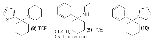 The N-ethyl analog of PCP (9), PCE, cyclohexamine, CI-400 of Parke Davis and Co.) first appeared in the Los Angeles area about 1969. The initial samples were a wet yellow to brown gum, and were sold and accepted as PCP. The average dose was somewhat smaller than PCP, however, suggesting a higher human potency. This is in keeping with reported animal data7. By 1971 this drug was available as a white solid, superficially indistinguishable from PCP hydrochloride; at no time was it identified other than as PCP. A single report in 1970 mentions the discovery of a clandestine laboratory presumably synthesizing this isomer12.