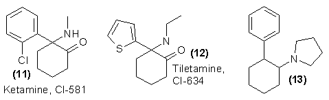 There is a defensive value in briefly reviewing the published scientific literature that exists concerning related compounds, for it may well be from these papers that clues can be obtained concerning tomorrow's pharmacologic and analytic problems. In the references already cited, there are literally dozens of analogs described, both chemically and pharmacologically. Implicit in the generalized directions are dozens more, many of which may reasonably be predicted to be of similar pharmacology. A host of analogs with the aromatic ring replaced with other functions such as benzyl, vinyl, allyl, acetyl, enyl, and cyano groups have been studied as anticholinergic agents, and appear to be similar in potency18-20. A related class of compounds that has already been clinically established as being pharmacologically equivalent to PCP, can be illustrated by the structure of ketamine (11). Although somewhat less potent than PCP, it produces at effective doses a depersonalization and intoxication state which, through word of mouth, is being touted as being superior to that produced by PCP. The thiophene analog of ketamine, tiletamine (12), is currently also in clinical study, and a large number of related analogs have been prepared.