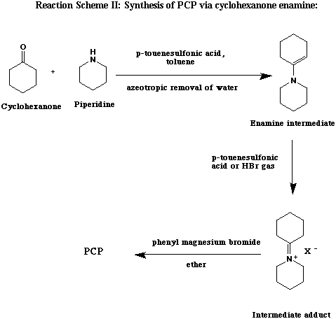 This method is used less frequently in underground synthesis, but has the advantage of not involving toxic cyanide compounds. The first step of the reaction is the dehydration of piperidine and cyclohexanone to form an enamine. The addition of anhydrous p-toluenesulfonic acid or dry HBr produces an intermediate imminium salt. Reaction of this salt with phenylmagnesium bromide yields PCP. This method is most applicable to cyclic secondary amine analogs such as piperidine, pyrrolidine, or morpholine, rather than an acyclic N-substituent such as ethyl or dimethyl (ref. 8, 12 ).
