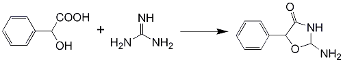 Using Sodium Metal as the Base: Slowly add 2.3 grams (0.1 mole) of sodium metal cut into small pieces to 50ml MeOH. Let the exothermic reaction subside and cool the beaker with ice/water. Add 12.2 grams (0.1 mole) of guanidine nitrate, and let stir for 30mins. Add 0.1 mole mandelic ester (18 g ethyl mandelate or 16.6 grams methyl mandelate) dissolved in 50ml MeOH. Reflux the resulting solution until the evolution of NH3 ceases (about 60 min). Let cool, and acidify to pH 2-4 with conc HCl. Filter off the precipitated crystals, and rinse with cold water and MeOH. Air dry to give the title compound as fine white crystals, mp 256-257°C.