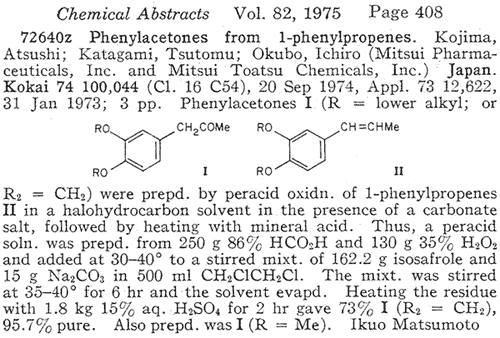 The procedures in this document all pertains to the oxidation of isosafrole to MDP2P, but they can be used on any propenylbenzene (such as anethole, isoapiole, isodillapiole and isomyristicin), except asarone. Asarone is a very acid-sensitive molecule, so it is clear that it won't work in a regular performic acid oxidation. It has not yet been proven if asarone cannot be used in a peracetic acid oxidation or a buffered performic. It would be interesting to hear about what would happen in a buffered peracetic acid oxidation.