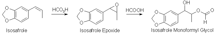 If performic acid is added to isosafrole (or any other propenylbenzene), the first step that happens is that the epoxide is formed. The three-membered epoxide is a strained molecule, and easily opens up in the presence of a strong acid, and formic acid is a strong enough acid to do that. Formic acid is always present in the solution, often as a solvent, or in any case it is formed from performic acid when it has transferred its extra oxygen atom to the alkene. The result is an ester between the isosafrole glycol, 1-(3,4-methylenedioxyphenyl)- 1,2-propanediol, and formic acid, here called isosafrole monoformyl glycol. This is the main reaction product gotten in this reaction. There are other oxidation products present, like residual epoxide, and some of the glycol without the ester group present, as well as some impurities gotten from over-oxidation of the isosafrole.