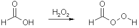 A very common way of turning a propenylbenzene into a phenyl-2-propanone (as exemplified here with the conversion of isosafrole to 3,4-MethyleneDioxyPhenyl-2-Propanone, MDP2P) is to oxidize the alkene (propenylbenzene) using a peracid. A peracid is a carboxylic acid which has been reacted with hydrogen peroxide to form a highly reactive peracid, which is able to transfer one of its oxygen atoms to the alkene, forming an epoxide (a three-membered ring containing two carbon atoms and one oxygen8. The peracid is formed like this, exemplified by the conversion of formic acid to performic acid: