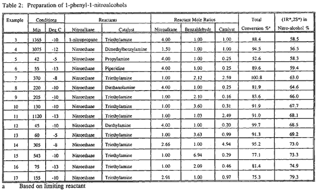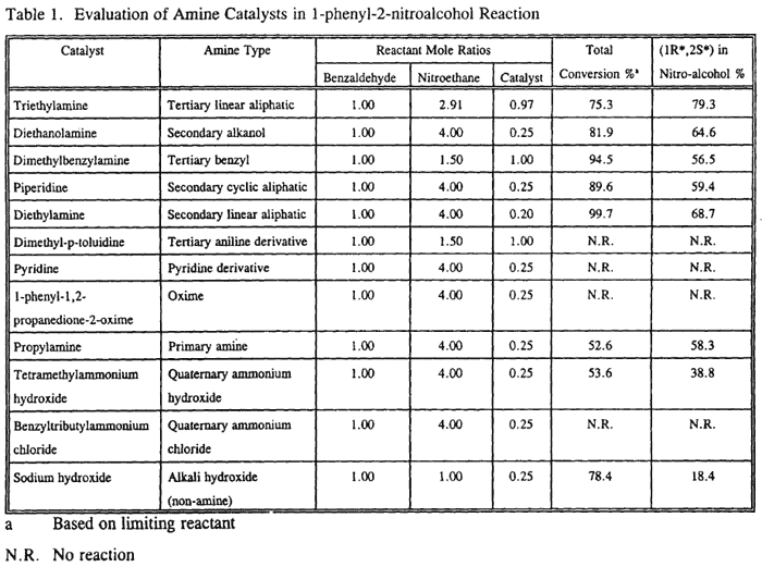 Amines of several different classes have been evaluated to determine their catalytic activity and selectivity for the production of the desired (1R*,2S*) nitroalcohol stereoisomer. The results are presented in Table 1.