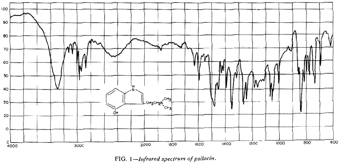 The dephosphorylation of psilocybin to psilocin in vivo has been well documented1,8,9 and is thought to account for most or all of its central nervous system activity8. Conversion of psilocybin to psilocin is also necessary for aqueous extraction with organic solvents because of the very low lipid solubility of psilocybin. Extraction of only one compound also permits infrared analysis of the extract.