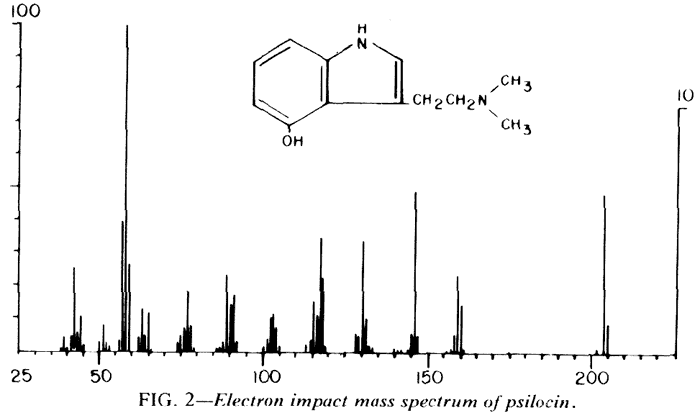 This method permits rapid isolation of psilocin from hallucinogenic mushrooms by co-extraction of both psilocin and psilocybin. Dilute acetic acid is an excellent solvent for this purpose, because both compounds are very soluble in acetic acid11 and very little of other interfering substances are extracted, It is most likely some other compounds are co-extracted but are removed from psilocin in the ether extraction from the aqueous base. Psilocybin is completely dephosphorytated to psilocin by heating the acid extract. After addition of the base, extraction into ether should be performed promptly, because of decomposition of psilocin at a greater pH than 712. The extraction and dephosporylation steps produce reasonably pure psilocin from a small amount of mushroom material. Two grams of mushrooms will often be sufficient to obtain an infrared spectrum of psilocin (Fig. 1). Smaller mushrooms exhibits provide ample psilocin for mass spectral analysis (Fig. 2).