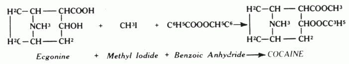1. The dried coca leaf is treated, through a chemical process, with an acid solution such as sulfuric acid, producing raw cocaine or coca paste. The coca paste which contains approximately 70% cocaine, is put through another chemical process with hydrochloric acid creating a hydrochloric salt or cocaine hydrochloride which is soluble in water. This particular process is very time consuming and can take from 1 to 2 weeks to complete. This process is used by both the legitimate and illicit manufacturers of cocaine. 2. The dry coca leaf is treated in a chemical process with a basic solution such as sodium carbonate, producing raw cocaine. The raw cocaine is then put through another chemical process with hydrochloric acid creating a hydrochloric salt or cocaine hydrochloride. This process is less time consuming than process No. 1 and it is probably the one preferred by the illicit manufacturer. 3. The third process is more advanced and technical than the other two procedures. The basic advantage of this process is that it gives a greater yield. The dried coca leaf, with it's various alkaloids including cocaine, is broken down into ecgonine which is the chemical base or core of the cocaine molecule. The ecgonine is then treated with methyl iodide and benzoic anhydride in a chemical process creating pure cocaine.