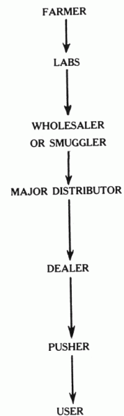 1: Cultivates, harvests and sells dried coca leaves to clandestine labs at a price of from $1 to $3 per kilo. 2: Extract cocaine from the dried coca leaves and sell pure cocaine to the wholesaler at a price of $3,000 per kilo realizing a profit of approximately $2,500 per kilo. 3: Directly sells or smuggles the kilo of pure cocaine to the distributer for a price of $18,000 per kilo realizing a profit of $15,000 per kilo. 4: "Cuts" the cocaine and sells pound quantities to dealers for $10,000 per pound (50% pure cocaine) realizing a profit of $22,000 from the original kilo he purchased. 5: "Cuts" the cocaine and sells ounce quantities (30-40% pure cocaine) to the pushers for $800-$1,200 per ounce, realizing a profit of $10,000 from the pound he originally purchased. 6: May "cut" the cocaine and sell gram (spoon) quantities to users for $50-$75 per gram realizing a profit of $1,000 from the original ounce he purchased. The original 100 kilos of dried coca leaf that it takes to produce 1 kilo of pure cocaine costs approximately $200. The kilo of pure cocaine will eventually be worth over $200,000 when sold to users in 25% pure gram quantities. The illicitly manufactured cocaine from the various clandestine cocaine labs in South America, is smuggled to various countries including the United States for black market trafficking and use. Those involved in the smuggling of cocaine vary from a one man operation to organized syndicates. The smuggling methods are unlimited and vary with one's imagination. Often times, cocaine is first smuggled into Mexico rather than directly from South America to the United States. Cocaine, as is heroin, is usually packaged in hermetically sealed plastic bags or rubber condoms for smuggling purposes. Once the cocaine enters the US, it is then distributed through various sub-dealers down to the users. Illicit cocaine, basically, comes in three forms: 1. The hard tiny rock form which is readily available, especially to the large wholesaler or dealer. 2. The flake form which is generally fairly pure cocaine which has been broken down into tiny flakes and considered a delicacy among users of cocaine. 3. The powdered form which is usually rock or flaked cocaine diluted with other substances such as lactose or procaine. In the illicit traffic of cocaine, as in many other drugs, there is a definite channel which the drug goes through from the harvester to the user. Initially, there is the farmer who cultivates, dries and ships the coca leaf to the illicit lab. The clandestine labs then chemically extract 90 to 100% pure cocaine from the leaf. From the lab, the cocaine is usually sold to smugglers or wholesalers at a price of $200 an ounce or $3,000 a kilo. The wholesaler smuggles the cocaine into the United States and sells it to a major cocaine distributor for a certain agreed upon price which varies and ranges from $18,000 to $22,000 a kilo. The distributor will then take the large quantity of cocaine and sell lesser amounts to a number of dealers. He may sell the cocaine in its pure form or dilute it and sell more for a lower price. Most of the traffickers keep in mind that cocaine loses its strength readily and sometimes the cutting or diluting agent will have a tendency after a period of time to begin destroying the cocaine content. When the dealers are in possesison of their 0.5 pound or pound of cocaine, they will most often dilute it with a cutting agent and sell it in ounce quantities to even smaller dealers. The cocaine street pusher will in turn, sell it to the user in gram quantities. Dilution or "Cutting" of CocaineThe paraphernalia and diluting agents for the cutting of cocaine are very similar to those used for heroin. One of the basic differences between "stepping on" (diluting) cocaine as compared to heroin, is that cocaine is usually only diluted down from 20 to 40%. The process for cutting cocaine varies from individual to individual with often times the large dealer using a more elaborate process, but the basic operation is the same throughout cocaine traffic. The basic paraphernalia used is:Diluting agent, scales, measuring spoons, flat nonporous surface, razor blade, playing card or some other sharp-edged instrument, sifter or nylon stocking, funnel and packaging container such as rubber condoms, tinfoil bindles or plastic baggies. The cutting or diluting agent used for cocaine again varies with the individual and the substance that is readily available to that individual. Some of the common cutting agents for cocaine are: Procaine which is a synthetic preparation in powder form used as a local anesthetic; Mannite, a sugar substance used as a laxative and produced in Italy; Menita, a milk sugar from Mexico and South America; Lactose or Dextrose, a white powdered milk sugar used as a baby food supplement and purchased readily in the United States in any drug store; Powdered methamphetamine also known as speed; Epsom salts; Quinine used to treat leg cramps and malaria; Powder vitamins purchased in health food stores and just about any soluble powder that is not disruptive to the body can be used, such as baking soda, powdered sugar, powdered milk, starch, etc The dealer will either be told the percentage of cocaine by a trusted "connection" or he will be able to approximate the percentage by various means. Some of the ways of ascertaining the approximate percentage of cocaine and the cutting agent are: 1. Quantitative chemical analysis which is an elaborate process requiring a qualified chemist and some elaborate laboratory equipment. 2. Cocaine drug testing kits either manufactured for law enforcement purposes or produced by the underground. These testing kits are simply presumptive color tests. The basic color test used for cocaine is cobalt thiocyanate. The cocaine or any of the other substances from the caine family will form a brilliant blue flaky precipitate in the cobalt thiocyanate. This is an indication that the product is cocaine, procaine, 