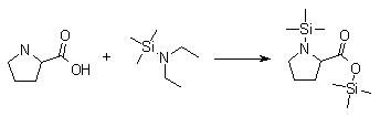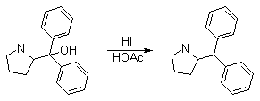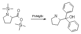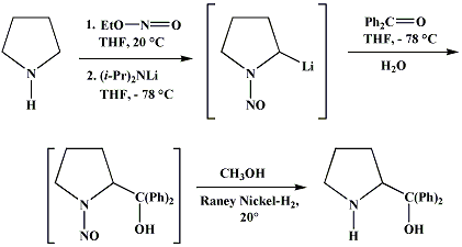 Synthesis:(S)-Diphenyl-2-pyrrolidinyl-methanol [1] ![]() Phenylmagnesium bromide was prepared from 61g Mg and 372g bromobenzene in 2L ether. Then 0.7L anisol is added, and the major part of the ether is distilled off. Then a solution of 52.2g (S)-proline ethyl ester in 80ml anisol is added, under light reflux. After 30 minutes of reflux one pours the solution into a solution of 1000g crushed ice and 372ml concentrated hydrochloric acid , filters, dissolves the precipitate in hot water and makes the solution basic with ammonia in the presence of ether. The ether layer is decanted and evaporated dry. The residue is washed with ethanol and dried. Thus obtained is 20g of (S)-diphenyl-2-pyrrolidinyl-methanol, in the form of colorless crystals. (S)-Diphenyl-2-pyrrolidinyl-methane [1] ![]() Into a solution of 125g (S)-diphenyl-2-pyrrolidinyl-methanol in 450ml acetic acid is added 1265ml of a solution of HI in 2N acetic acid. This is then heated to 115°C on the oil bath for 5 minutes and then cooled quickly. To the cooled mixture is added 1260ml of a saturated solution of sodium thiosulphate, and then evaporated to dryness. The residue is put into 630ml water and filtred. The precipitate is dissolved in 1000ml of methanol, and filted. The organic phase is made basic with soda. Then 600ml water is added, the methanol is removed by distillation, and the aquous solution is extraced with ether. The ether solution is evaporated to dryness. Thus obtained is 115g of crude (S)-diphenyl-2-pyrrolidinyl-methane. This is dissolved in dry ether and concentrated hydrochloric acid is added until PH = 4, and then filtered. The precipitate is dried and washed with acetone and ether. The hydrochloride is purified by recrysalisation from boiling water. One obtains 70 to 80g of the hydrochloride of (S)-diphenyl-2-pyrrolidinyl-methane. Synthesis of (S)-2-(Diphenylhydroxymethyl)pyrrolidine [3](S)-1-(Trimethylsilyl)pyrrolidinyl-2-trimethylsilylcarboxylate ![]() 11,5 g (100 mmol) (S)-Proline and 34,90 g (240 mmol) N,N-diethyl-trimethylsilylamine were heated in an oil bath at 110-120°C, and the formed diethylamine was continuously distilled off. After 6h the heating was terminated since no more diethylamine was formed. Vacuum distillation of the residue gave 24.53 g (94.5%) of (S)-1-(trimethylsilyl)pyrrolidinyl-2-trimethylsilylcarboxylate (bp 97°C/14 mbar) as a very hydrolysis-sensitive clear liquid. (S)-2-(Diphenylhydroxymethyl)pyrrolidine ![]() The Grignard complex prepared from 7.29 g (300 mmol) magnesium and 47,1 g (300 mmol) bromobenzene in 350 ml absolute Et2O was added dropwise to 19.46 g (75 mmol) of the above ester in 30 ml absolute Et2O at 0-20°C under argon atmosphere. The reaction solution was heated under reflux for 4h, cooled to 0°C and poured slowly with stirring into 450 ml 2N ice-cold hydrochloric acid (360 g ice + 90 ml conc. HCl). The white precipitate was filtered by suction, washed with methyl tert-Butylether, water and recrystallized from Methanol/methyl tert-Butylether. By collecting several fractions, there was obtained 14,26 g (49,2 mmol) of crude (S)-2-(Diphenylhydroxymethyl)pyrrolidine.HCl with a purity of 65.6%, mp 285-290°C. The crude (S)-2-(Diphenylhydroxymethyl)pyrrolidine.HCl was added to a mixture of 100 ml 1N NaOH, 5 ml triethylamine and 200 ml methyl tert-Butylether, and the mixture stirred until two clear phases formed (about 5h). The phases were separated and the aqueous phase extracted twice with methyl tert-Butylether. The pooled organic phases were washed twice with 20% aqueous NaCl solution, dried over MgSO4, filtered and the solvent removed under vacuum at a bath temp of 40°C. The residue was taken up in hot n-heptane, and upon cooling clear, yellowish crystals precipitated. Thus, there was obtained 12.01g (63%, 47.5 mmol) of (S)-2-(Diphenylhydroxymethyl)pyrrolidine (mp 76.5-78°C). DL-alpha-(2-Pyrrolidyl)benzhydrol Hydrochloride [4]![]() dl-Proline ethyl ester (4.7g) was added dropwise at room temp to a stirred solution of phenylmagnesium bromide (4 molar equivalents) in ether. After addition of the ester, the mixture was boiled under reflux for 2h and then hydrolyzed with dilute ammonium chloride. The ether layer was separated and the aqueous solution extracted thrice with toluene. The combined extracts wre was washed with water, dried over sodium sulfate and evaporated in vacuo to yield an oil (4.5g). It was converted to the hydrochloride and recrystallized from methanol-ether, mp >250°C. An aliquot of the hydrochloride salt converted to the free base and recrystallized from ethanol-water had mp 81-82°C (lit. [5] mp 83°C). (S)-1,1-Diphenylprolinol [7]![]() A. N-(tert-Butoxycarbonyl)pyrrolidine. A 500-mL round-bottomed flask, equipped with magnetic stirring bar, is charged with dichloromethane (CH2Cl2) (120 mL) and pyrrolidine (11.3 mL, 133 mmol) (Note 1). The flask is fitted with a 60-mL, pressure-equalizing addition funnel vented through a mineral oil bubbler and charged with a solution of di-tert-butyl dicarbonate (24.6 g, 112 mmol) in CH2Cl2 (35 mL) . After the pyrrolidine solution is cooled to 0°C in ice, the colorless dicarbonate solution is added dropwise over a period of 30 min, and the resulting solution is stirred at room temperature for 3 hr (Note 2). The solvents are then removed under reduced pressure, and two consecutive Kugelrohr distillations of the residual oil (oven temperature 80°C at 0.2 mm) afford 16.6 g (87%) of N-Boc-pyrrolidine as a colorless oil (Note 3). B. (R)-(+)-2-(Diphenylhydroxymethyl)-N-(tert-butoxycarbonyl)pyrrolidine. An oven-dried, 2-L, three-necked flask, equipped with a magnetic stirring bar and a thermocouple (Note 4), is charged with (-)-sparteine (30.2 mL, 131 mmol) (Note 5), N-Boc-pyrrolidine (15.0 g, 87.6 mmol), and anhydrous ether (900 mL) (Note 6). The solution is cooled to -70°C (dry ice/acetone bath) (Note 4). To this solution is added sec-butyllithium (96 mL, 1.16 M in cyclohexane, 111 mmol) (Note 7) and (Note 8) drop