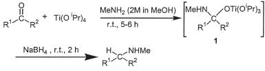 As a sequel to this work, we reasoned that a more convenient transformation might be achieved using a commercially available solution of methylamine in methanol. We report herein the results of this investigation leading to a rapid, high-yielding protocol for the preparation of N-methyl secondary amines. The efficacy of the protocol has been evaluated on a varied set of carbonyl compounds and the results were compared with our reported5 data. The starting aldehydes and ketones were reacted with a commercially available methanol solution of methylamine (2 M) for 5–6 h in the presence of titanium(IV)isopropoxide, followed by the addition of solid sodium borohydride. The reaction mixture was allowed to stir for a further period of 2 h and quenched with water. The reaction is possibly proceeding through the formation of the titanium(IV)complex 1 (Scheme 1) as an intermediate5, which is reduced either directly or via transient iminium species. Titanium(IV)isopropoxide has been utilized5,6 as a mild reagent compatible with a variety of potentially acid-sensitive functional groups that include acetal, lactam, acetonide and tert-butyldimethylsilyl ether.