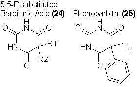 The barbiturates represent one of the oldest and best established pharmacologic examples of the sedative-hypnotics or depressants. In the strictest sense, the barbiturates are any of some 35 prescribable 5,5-disubstituted derivatives of bartituric acid in accordance with the generalized formula 24. In their variation of structure, the R groups can vary from C1 to C6 alkyl groups, with or without unsaturation, with or without bromo groups, and one can be the phenyl group. None of these drugs are highly potent; it is rare to find a prescription calling for less than 50 mg, and with some of the longer acting drugs ten times this level is commonly used.
