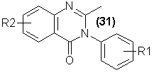 Although this family of readily synthesized chemicals was originally prepared with antimalarial activity in mind, the first pharmacologic activity observed was that of analgesia68. The evaluation of a number of these materials as hypnotics69 led to the selection of methaqualone as a preferred clinical choice. The widely recognized abuse of this drug led to the proposal to list it as a Schedule II drug70. However, a large number of derivatives both with substitution variation in the mono-substituted phenyl ring [31, R1] and in the fused benzo-ring [31, R2] have been found to possess varying degrees of sedative and hypnotic activity [71]. Currently, several are being clinically explored. [Mecloqualone (31), R1 = Cl, R2 = H72; Ethinazone, R1 = C2H5, R2 = H73; SL-164, R1 = 2-CH3-4-Cl, R2 = 5-Cl74]. The simple synthetic procedures that give rise to members of this family, the interaction between acetylanthranilic acid and a substituted aniline, promise an almost unlimited variety of future abusable drugs.