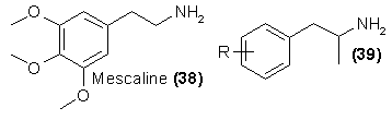 The second class of hallucinogenic substances that might well serve as a starting pont for future study and thus for future abuse is the phenethylamine class. The parent compound is mescaline (38). It has been observed that if the alkyl chain is extended to a length of three carbons as shown in 39, then reorientation of the methoxyl substitutions86 and appropriate changes in the substitution patterns87 can markedly amplify the potency of resulting hallucinogen.