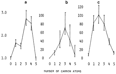 Several behavioral approaches have been studied. The use of unrestrained or untrained animals was the basis of Hall's open-field test (Hall, 1934) in which animal activity patterns (rearing, preening, defecation, ranging) were found to be influenced to a degree proportionate to a drug's potency in man. Lipman et al. (1963) have applied this test to a series of piperidinoglycolates, and Brimblecombe (1963, 1967) to a number of tryptamines. Behavioral tests in other animals [in mice, a head-twitch assay (Coyne and Pickering, 1967) and interference with nest-building (Schneider and Chenoweth, 1970); in cats (Brimblecombe et al., 1964), and a sham-rage response syndrome (Benington et al., 1958); in monkeys (Hunt and Brimblecombe, 1967)] are usually restricted to small groups of closely related compounds. A behavioral response assay (the Bovet-Gatti drug profile) has been restructured to allow for the evaluation of psychotomimetic drugs (Smythies et al., 1969). A recent review (Brawley and Duffield, 1972) has analyzed the extensive literature concerning these correlates. A failing with most of these assays is the need to employ large doses of the drug. In most cases these are approaching the lethal dose, and are certainly well above the dose/weight equivalent employed in man. Several specific assays have been critically analyzed (Silva and Calil, 1975) and it has been shown that not all families of drugs are validly detected and certain CNS agents that are not psychotomimetic respond as if they were; in general it is concluded that they are of limited value.