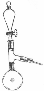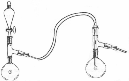 Hydrogen sulfide is what we commonly know as rotten egg gas and the smell of stove gas since it found in both. This is what will kill most people. Don't let its familiarity disguise it's hazards. It is extremey poisonous and exposure to small quantities numbs ones perception of increasing concentrations; although, it will remain unmistakably present. To generate the H2S dilute muriatic acid with an equal volume of water and fill the separatory funnel. Fill the reaction flask with powdered iron sulfide. Run in the HCl solutioan at such a rate as to keep steady bubbling in the receiving flask. The H2S can be bubbled through a flask containing water to remove HCl(not shown) before entering the receiving flask. The receiving flask should contain a constantly stirred (magnetic stirrer) suspension of 120g I2 (iodine, solid not tincture) and 150 ml water. The H2S that is not absorbed in the iodine suspension is bubbled through a lye solution(not shown) and then out through the fume hood. The solution will become clear(from red) and sulfur will accumulate in the flask when the reaction is complete. The sulfur is filtered out and the solution boiled in a hood to drive out dissolved H2S gas. The boiling is continued until no black precipitate(copper sulfide) forms when 1ml of the solution is added to a cupric nitrate solution (1g in 10ml of water). The solution is then distilled being sure to add boiling chips. The fraction boiling from 125°C to 127°C is collected. This is the acetropic 57% solution, bp 126°C(@760mmHg), density 1.70. Store the acid in a dark bottle and use soon after preparation to avoid considerable decomposition. The yield is 90% based on iodine consumed. Chlorine [8]Chlorine can be simply prepared using the same gas generator as used for HCl and H2S. Fill the separatory funnel with muriatic acid (hydrochloric acid from the hardware store). Fill the reaction flask 1/4 full with calcium hypochlorite (swimming pool chlorine). Slowly add the acid solution to the flask and lead the gas formed through the tubing to the solution receiving the gas. Be warned that chlorine gas is much more overpowering and destructive to mucous membranes than HCl and ammonia. Excellent exhaust is a must. Chlorine gas can also be prepared by adding sulfuric acid to a mixture of table salt and manganese dioxide. The HCl that is formed from NaCl and sulfuric acid is immediately oxidized to chlorine. Some info on the preparation of the other halogens, bromine and iodine, can be found in Comprehensive Inorganic Chemistry Vol III such as isolation iodine from kelp ash. Acetic Anhydride(from acteone and acetic acid) [9][108-24-7] Acetic Anhydride is hot on the DEA's list due to its use in the manufacture