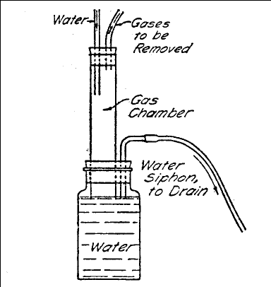Any ammonia vapor evolved in the reaction flask is led through the drying tube (important) and absorbed in the gas chamber by a flow of running water. The water in the lower flask serves as a seal. The absorption chamber can be assembled from readily available glass tubing, rubber stoppers, and a wide-mouthed bottle. As described by Hancock, the flask is also fitted with mercury sealed stirrer, but this can be omitted and replaced by frequent hand-swirling of the reaction flask. Before setting up, the flask should be dried in an oven and assembled rapidly to exclude moisture. It is also possible to set the apparatus in a hood, to vent any ammonia which might escape accidentally.