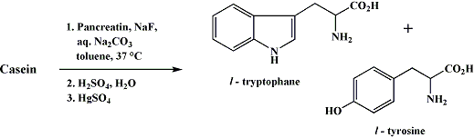 In an 8 Liter bottle is placed 600g of commercial casein (coarse powder), which is then covered with about 3200 mL of tap water at 37°C. The bottle is shaken until all the casein is moistened. A solution of 60 g. of anhydrous sodium carbonate and 6 g. of sodium fluoride (to inhibit oxidase enzymes present) in 1 L of water at 37°C is added. A thin paste of 20 g. of commercial pancreatin in 100 mL of water (37°C) is poured in. The mixture is covered with a layer of toluene (80 mL), diluted to 6 L, stoppered, shaken thoroughly, and placed in a warm room or bath at 37°C. After four or five days, with daily shakings, most of the casein is in solution and chalky masses of tyrosine begin to separate. After five days, a second 20-g. portion of pancreatin in 100 mL of water is added. After twelve days, the bottle is cooled in an icebox overnight and the undissolved material is filtered off (This filtration may be slow. Büchner funnels of 20-cm. diameter are best used; the material from a single filling is allowed to suck dry and the filter paper then changed).