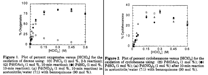 The addition of strong acids to a solution of acetonitrile/water (7:1 v/v) containing 1-decene (0.2 M), Pd(OAc)2 (0.004 M), and benzoquinone (0.18 M) accelerated the Wacker oxidation by as much as a factor of 50 compared to a standard literature procedure3. The reaction was inhibited by HCl but accelerated by sulfuric, nitric, perchloric, or tetrafluoroboric acid (Table 1). In the latter two cases the conversion after only 10 min was quantitative and gave a higher selectivity toward 2-decanone, presumably because the olefin isomerization could not compete as effectively with oxidation in these cases. In principle, any strong inorganic acid possessing noncomplexing anions can be used to effect the acid acceleration.